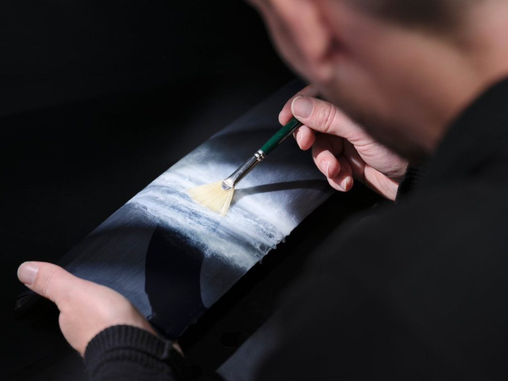 Bu kompozisyonun geliştirilmesi, boya tonlarının uyumları, uygulama teknikleri ve vernikleme süreçlerinin iyileştirilmesi için iki aylık bir deneme sürecini gerektirdi. Gerçekçi dalga etkisini elde etmek için pigment, ıslak verniğin üzerine püskürtülerek ardından ince bir fırça desteğiyle ve el işçiliğiyle şekillendirildi. Sanatçı yüzey boyunca havayı yönlendirip boyayı elle ustalıkla yönlendirerek doğal ve akıcı bir hareket hissi yarattı.
