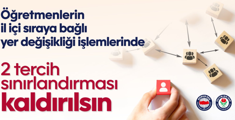 Eğitim-Bir-Sen, öğretmenlerin il içi sıraya bağlı yer değişikliği işlemlerinde uygulanan iki tercih sınırlamasının kaldırılması talebiyle Milli Eğitim Bakanlığı’na başvuruda bulundu.