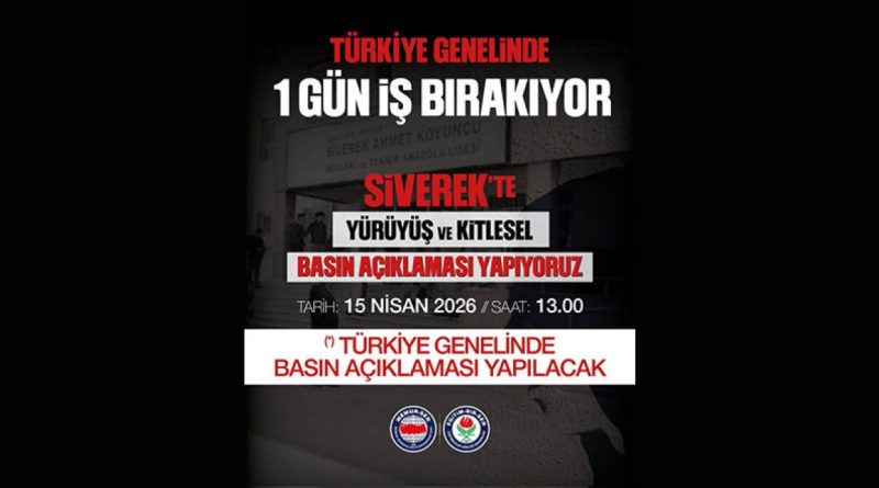 Siverek Ahmet Koyuncu Mesleki ve Teknik Anadolu Lisesi’nde yaşanan saldırının ardından Eğitim-Bir-Sen, 15 Nisan 2026 tarihinde Türkiye genelinde bir gün süreyle iş bırakacağını duyurdu. Sendika, aynı gün Siverek’te kitlesel bir yürüyüş ve tüm illerde geniş katılımlı basın açıklaması gerçekleştirecek.